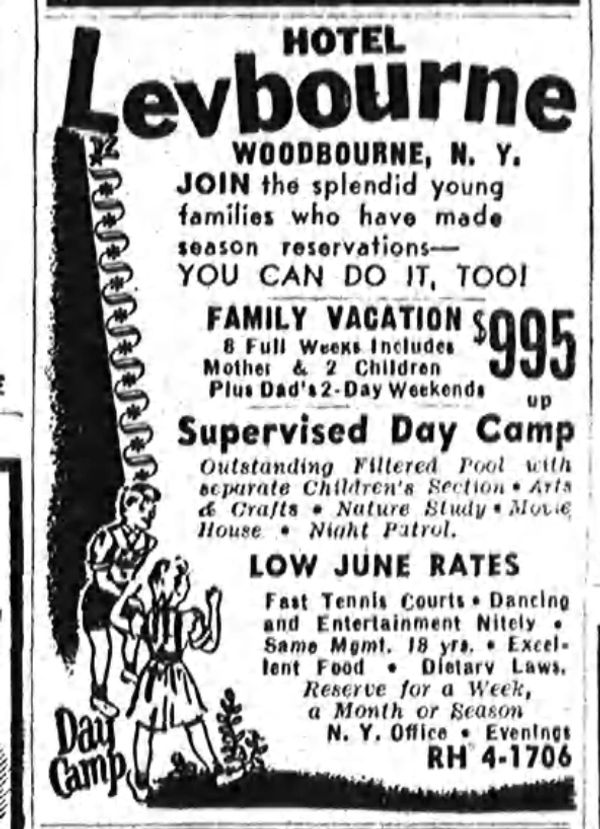 The Levbourne boasted of the “finest professional tennis and handball courts,” as well as boating, fishing, baseball, ping-pong, horseback riding, and “a new open-air solarium for nude bathing.” It offered its guests a private bathing beach, a prominent social staff, a popular orchestra, and free transportation to and from the railroad station in South Fallsburg.