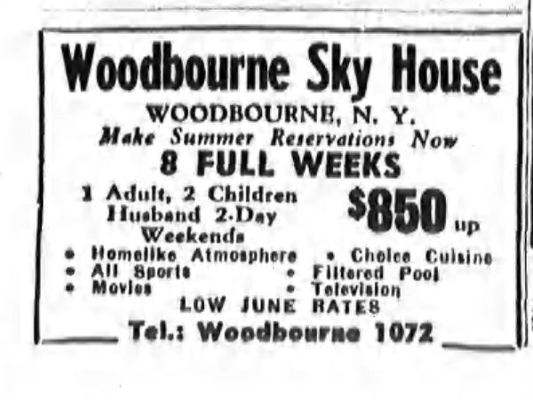By the 1950s, Woodbourne also had a thriving resort industry. Originally the Levbourne, the Aladdin evolved into an Arabian-themed resort with the Ali Baba Nightclub, Mirage Canteen and Sinbad Building. Chesters’ was an adult resort known for an emphasis on arts and culture. Both resorts, along with others in the area, were run by women.